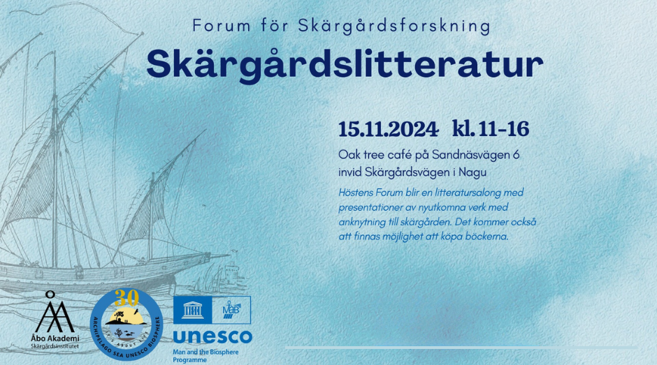 Välkommen med på Forum för skärgårdsforskning fredag 15.11, kl. 11–16! Temat är Skärgårdslitteratur. Vi får höra om nyutkomna verk som handlar om skärgården och det finns möjlighet att köpa böcker.
