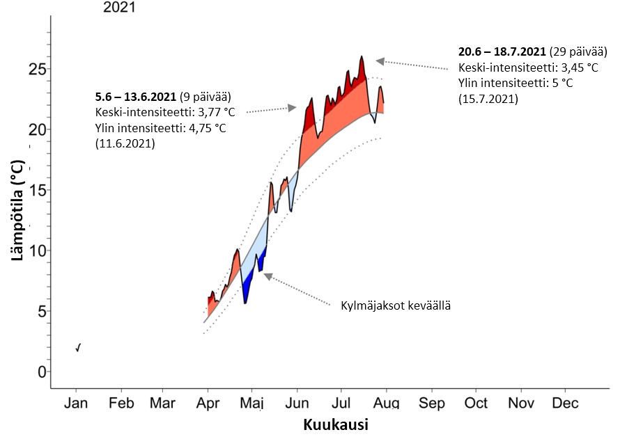Kesä-heinäkuussa 2021 rekisteröitiin Husön biologisen tutkimusaseman edustalla Ahvenanmaalla kaksi merellistä lämpöaaltoa. Ensimmäinen jakso (5.–13.6.) kesti 9 päivää ja toinen (20.6.–18.7.) 29 päivää.