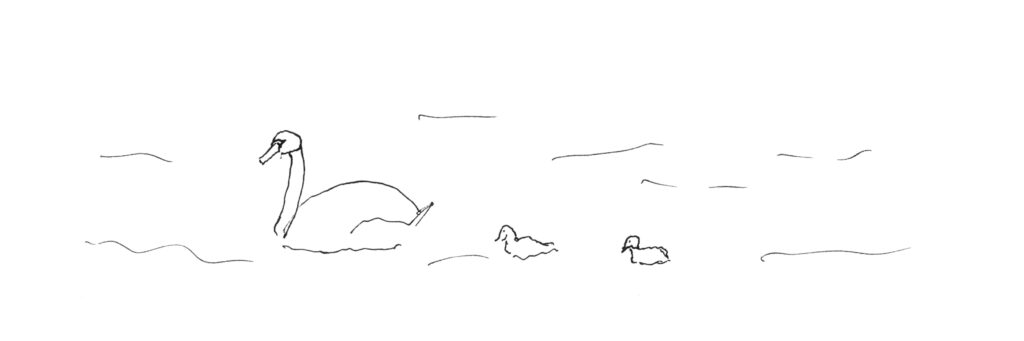 Vattnet är friskt, så där tio grader. Aktersvallet från ett fartyg gör att jag guppar upp och ner. Äldre blir jag inte än att det alltid ger mig ett lyft. Efter badet sätter jag mig med kikaren i solskenet på en vitmålad stol som stått hopfälld vid bastuväggen. Svanungarna är fortfarande fyra, nu på väg ut i farleden med kurs på Nagu.