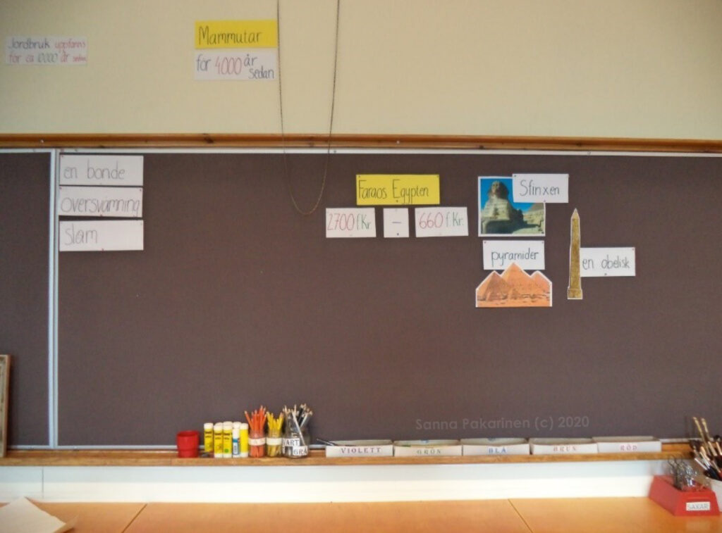 Centrala begrepp kan visualiseras och placeras på bra ställen i klassrummet, precis som på bilderna, för att stöda inlärningen av skolspråket.