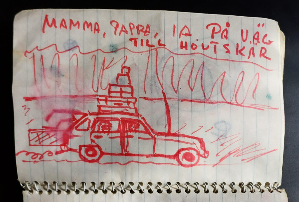 Under min uppväxt levde vi äkta gammaldags sommarliv. När min lärarmamma fick sommarlov packades bilen full med krukväxter, kanin och andra förnödenheter och så flyttade vi ut i skärgården på riktigt. Tre generationer levde mer eller mindre under samma tak med utetupp, gasspis och utan rinnande vatten. Det var i skärgården vi hade vårt högkvarter, dit post och tidningar nådde oss under somrarna. Vår stadslägenhet tjänade bara övernattningsbostad fram till skolstarten i augusti. Kanske vår bil inte var fullt så belamrad i verkligheten som på pappas illustration, men inte långt ifrån. I ett litet skrivhäfte från mina första år trängs mina egna huvudfotingar med teckningar som nära och kära ritat tillsammans med mig. På en sida har pappa ritat vår lilla familj i den gröna Renaulten på väg på sommarlov.