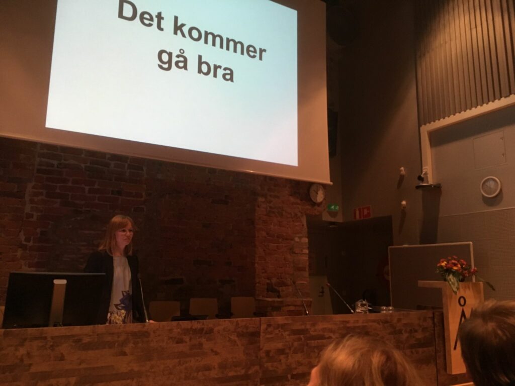 Minna Levälahti, språkvårdare vid Svensk Presstjänst, föreläste och diskuterade med publiken om tendenser i språket av i dag. Till exempel håller ”att” på att försvinna i uttryck som ”Det kommer (att) gå bra.” Något som i denna skribents öron fortfarande låter främmande. Foto: Kristina Granstedt-Ketola