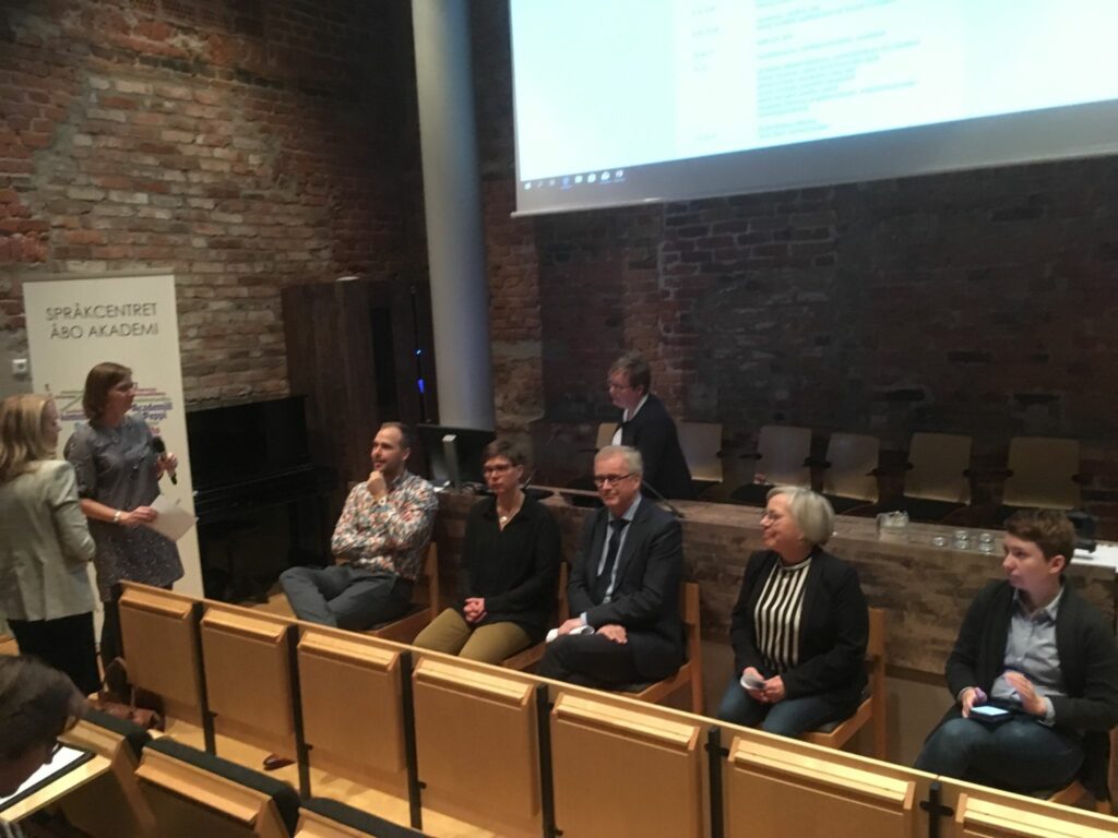 Dagens paneldebatt hade temat ”Språklig kompetens i arbetslivet”. I panelen medverkade Martin Norrgård, Josefin Torrkulla, Robert Backman, Marianne West och Alexandra Wasberg. De representerade både arbetslivet och de studerande. Moderator var Mikaela Björklund, universitetslärare i de främmande språkens didaktik.