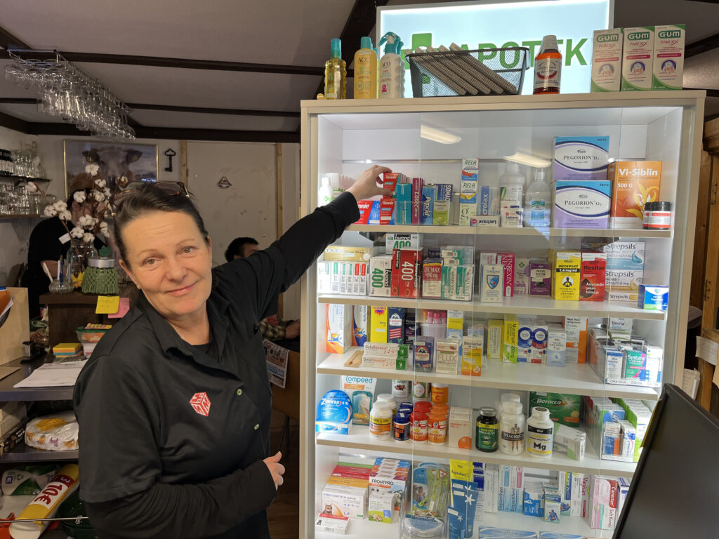 Jag frågar när paret egentligen har ledigt, varvid de tittar på varann och svarar: “På söndag. Kanske.” Butiken har också apoteksskåp och pakettjänst. Leveranser från Alko kan man inte längre stå till tjänst med, eftersom det inte längre går bussar ut till Hitis. Men i princip alla andra leveranser kan butiken ordna, stora som små.