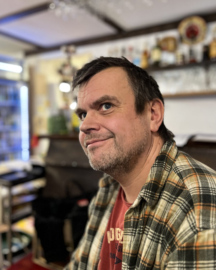 Mycket riktigt slår en välkomnande värme och doften av köttsoppa emot oss när vi stiger innanför dörren till lanthandeln. Ungefär samtidigt kommer Tor-Björn Holmström bärande med famnen full av lådor från det bakre lagerutrymmet, medan Maria ”Mia” Weurlander-Holmström står bakom bardisken och häller upp en öl till en av lunchgästerna. För det här är inte “bara” butik, det är också något av byns hjärta såhär vintertid. Lunch serveras varje vardag, medan puben – och därmed butiken – är öppen till sju varje onsdag och fredag.