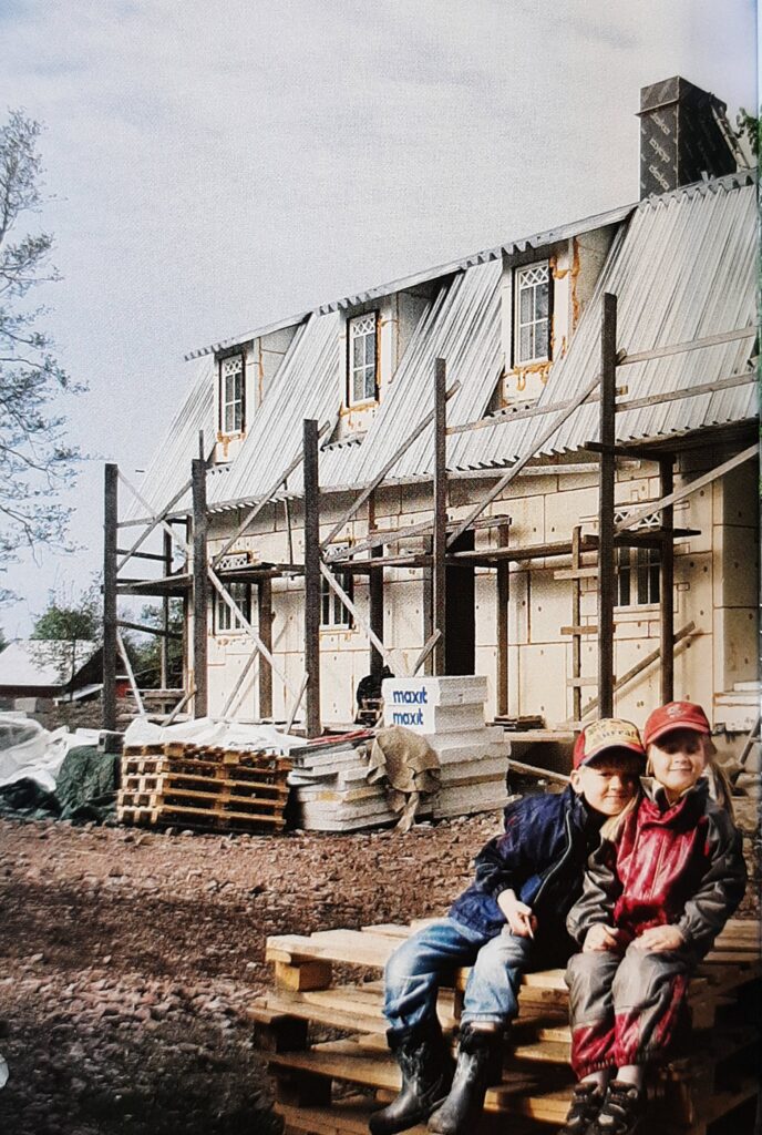 – Enligt normerna får man ha ett brinnande material som torvtak på ett bostadshus, om man har ett brandklassificerat material under, därav plåten. Vi ska också kunna elda i spisen fast det är torrt, så förutom ett gnistskydd på skorstenen kommer ett bevattningssystem för taket. Om det skulle gå så illa att torven fattar eld – eller brandvarnarna ger signal, bevattnas taket automatiskt. Samma system fungerar som bevattningssystem för gräset när det är torrt.