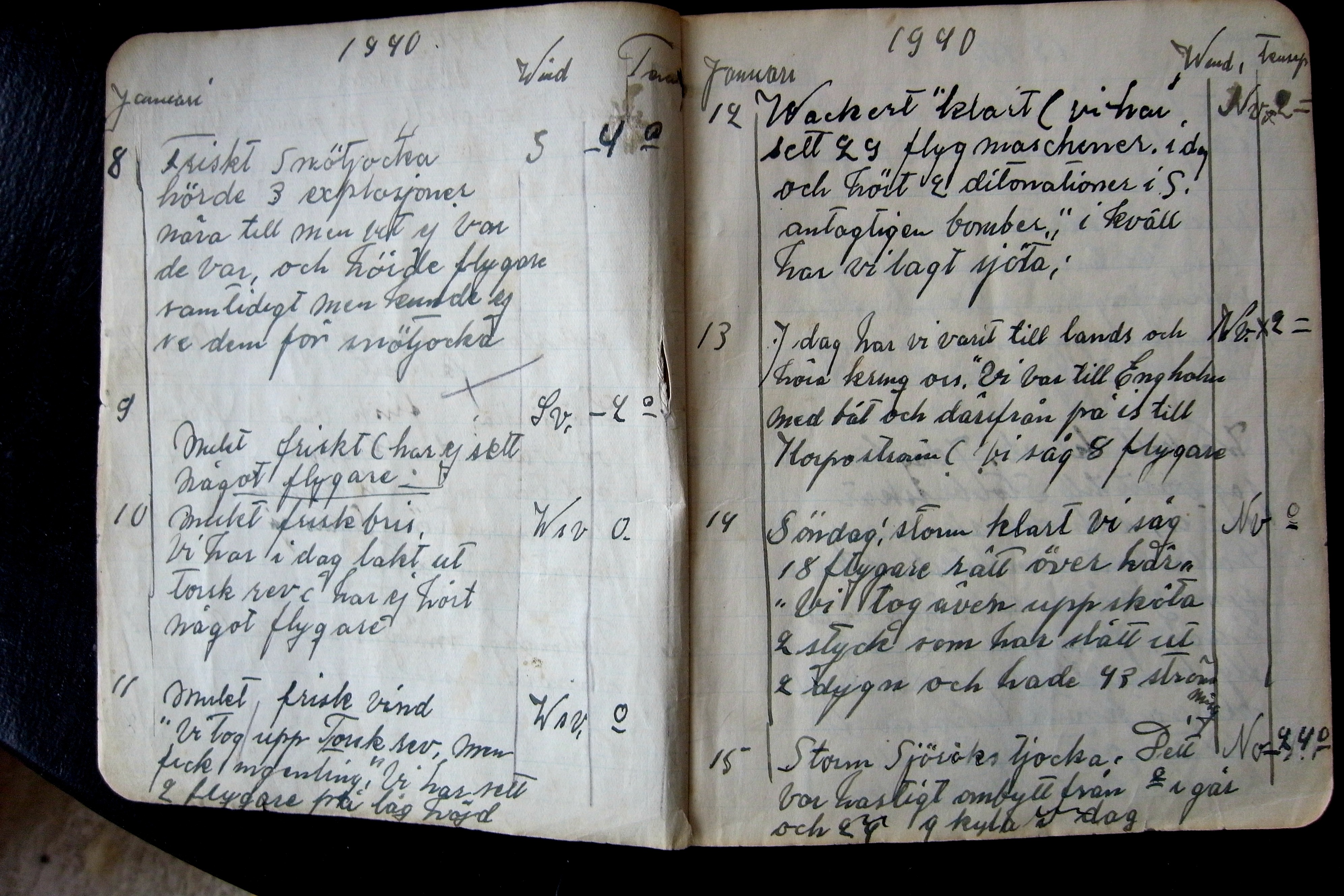 Dagboken från krigsvintern 1940 börjar den 1 januari och slutar den 21 maj. Anteckningarna är kortfattade, de noterar vind, temperatur och hur många ryska flygplan som passerat. På den närmaste bebodda ön, Brunskär, är alla evakuerade, så även de flesta på andra utskärsöar. Rågskär var då en skoglös holme. När Fritjof skriver att han hämtat ”ett lass bar” innebär det att han hämtat brännved för mat och värme från holmar runtomkring. Han skriver mycket sparsamt om fiske, men den 10 januari skrev han ”vi tog upp torskrev men fick ingenting”, och den 14 januari ”Vi tog även upp sköta 2 styck som stått ute 2 dygn och hade 43 strömming”. Vad levde de på dessa kalla månader under krigsvintern 1940?