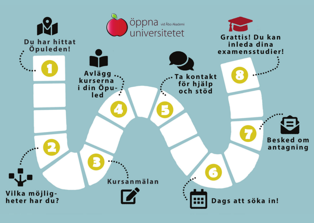 Det finns alternativa ansökningsvägar till universitetet. Via Öppna universitetsleden, alltså Öpuleden, kan du läsa universitetskurser utan att vara inskriven vid ett universitet. Med dina avklarade kurser kan du ansöka om studieplats för examensstudier på kandidatnivå vid Åbo Akademi och sedan få kurserna till godo inom din examen.