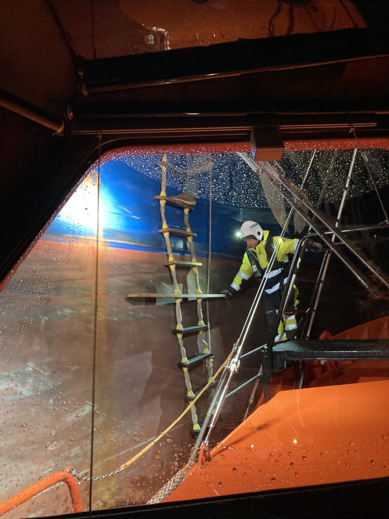 När lotskutterföraren styr ut från hamnen känns det som att sitta i en lastbil, stabilt och tungt, med de starka maskinerna mullrande under en. Ute på redden står vi stilla och väntar, och här kränger till och med lotskuttern i vågorna. Jag försöker förgäves få syn på fartyget i mörkret, men alla blinkande sjömärken längs farleden förvillar ögonen. Ännu när vi sätter fart framåt för att åka upp längs läsidan om fartyget har jag svårt att tolka vad jag ser i mörkret. Men så mitt i allt tornar fartygets blåa fartygssida upp sig! Högt där uppe skymtar redan lotsen, och medan de två fartygen åker sida vid sida i några knops hastighet klättrar lotsen snabbt ner längs lejdaren och tas emot av den andra lotskutterföraren ombord. Och några sekunder senare är BBC NILE redan tiotals meter ifrån oss, på väg till sin slutdestination i södra Östersjön.