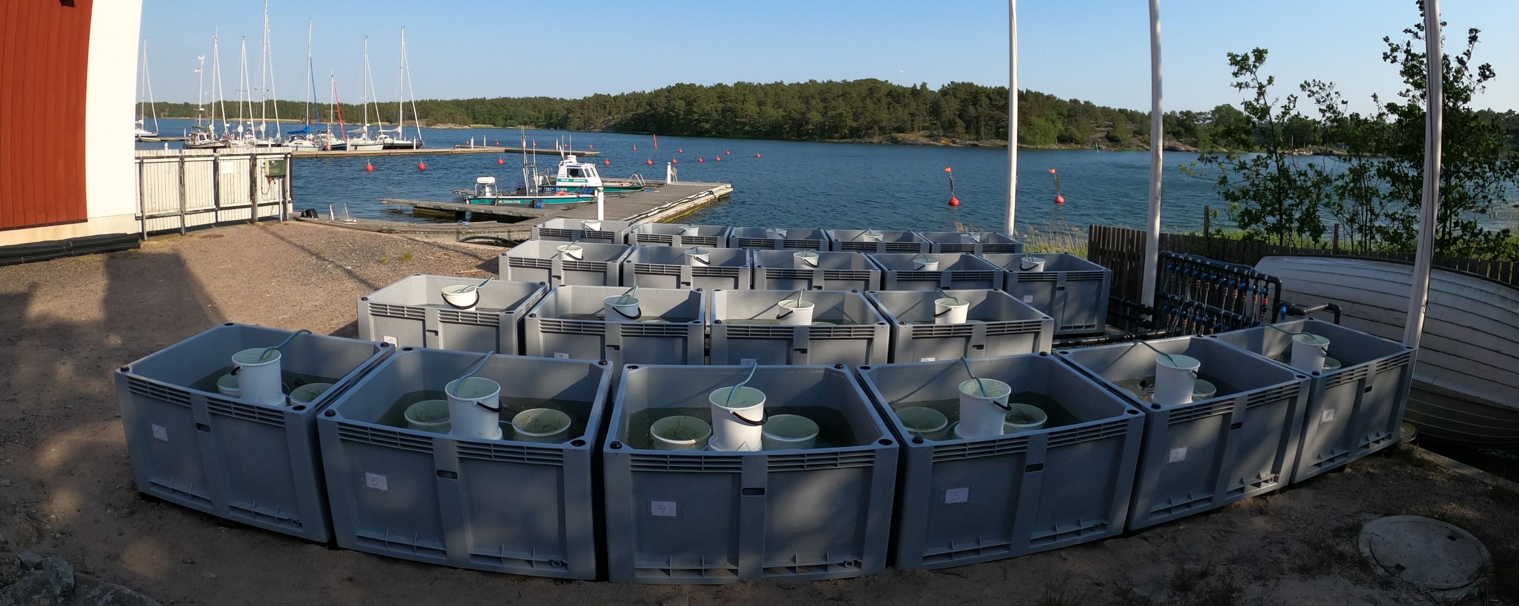 Each system comprises twenty 600 L polyethylene tanks (Schwer-PALOXE 1130 x 930 x 600 mm) supplied with a constant flow-through of unfiltered seawater from a water depths of 2 m (Korpoström: GRUNDFOS SP 5A-12 R 5 from around 20 m from the tank system; Husö: Isku-Jet 3RP from around 300 m from the tank system).