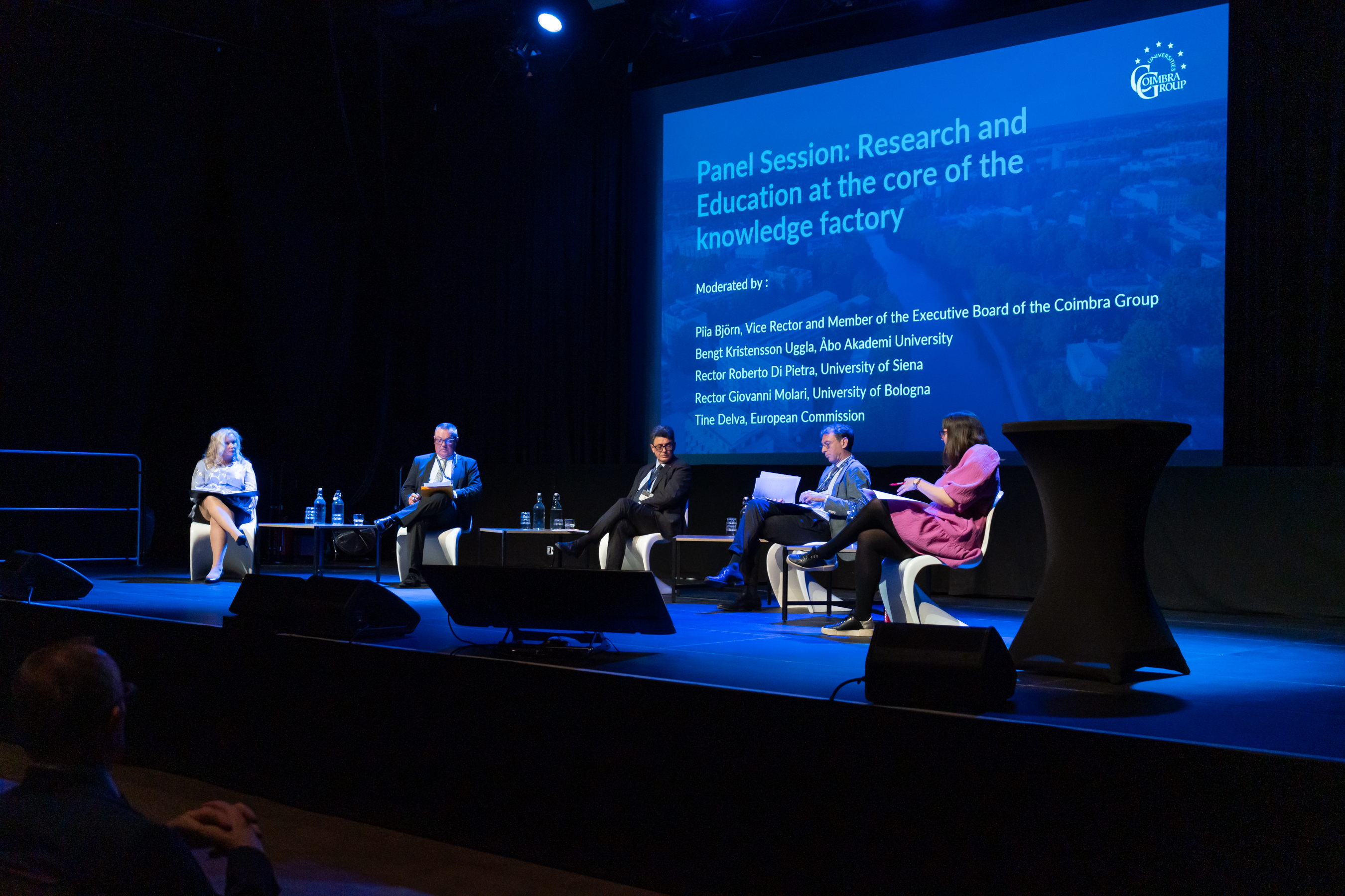 The panel discussion Research and Education at the core of the knowledge factory , which was held after the presentations, also focused on the synergies between research and education. The discussions were moderated by Vice Rector of the University of Turku Piia Björn. During the discussion, panellists Bengt Kristensson Uggla (Åbo Akademi University), Roberto Di Pietra (University of Siena), Giovanni Molari (University of Bologna) and Tine Delva (European Commission) emphasised the need to strengthen multidisciplinary approaches in education and research to be better able to meet global challenges. In addition to individual and institutional competition, the panellists called for effective cooperation and decisions that support administrative structures and flexibility to enable universities to engage in interdisciplinary research and education.