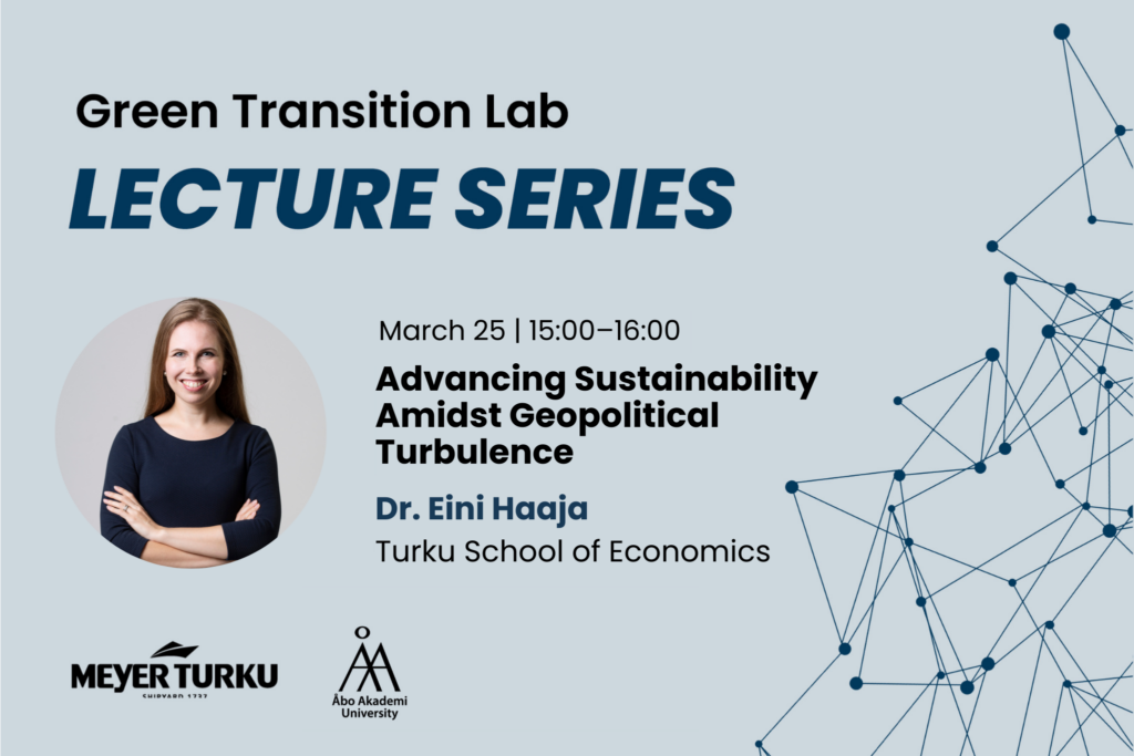 Seriens första föreläsning har rubriken Advancing Sustainability Amidst Geopolitical Turbulence och den hålls av ED Eini Haaja, Handelshögskolan vid Åbo universitet.