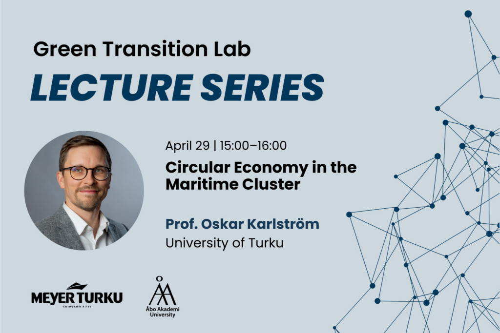 Seriens andra föreläsning har rubriken Circular Economy in the Maritime Cluster och den hålls av professor Oskar Karlström, Åbo universitet.