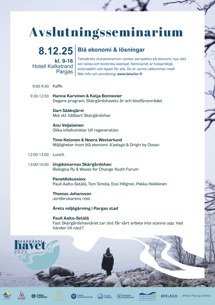 Årets sista seminarium hålls måndagen den 8 december kl. 9–16 på Hotell Kalkstrand i Pargas. Fokus ligger på lösningar för ett välmående Skärgårdshav och på möjligheterna inom blå ekonomi. Klicka här för att anmäla dig.