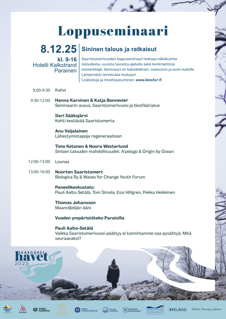 Vuoden viimeinen seminaari järjestetään maanantaina 8.12 klo 9–16 Hotelli Kalkstrandissa Paraisilla. Päivän teemoina ovat ratkaisut Saaristomerta uhkaaviin ongelmiin sekä sinisen talouden mahdollisuudet. Ilmoittaudu seminaariin!