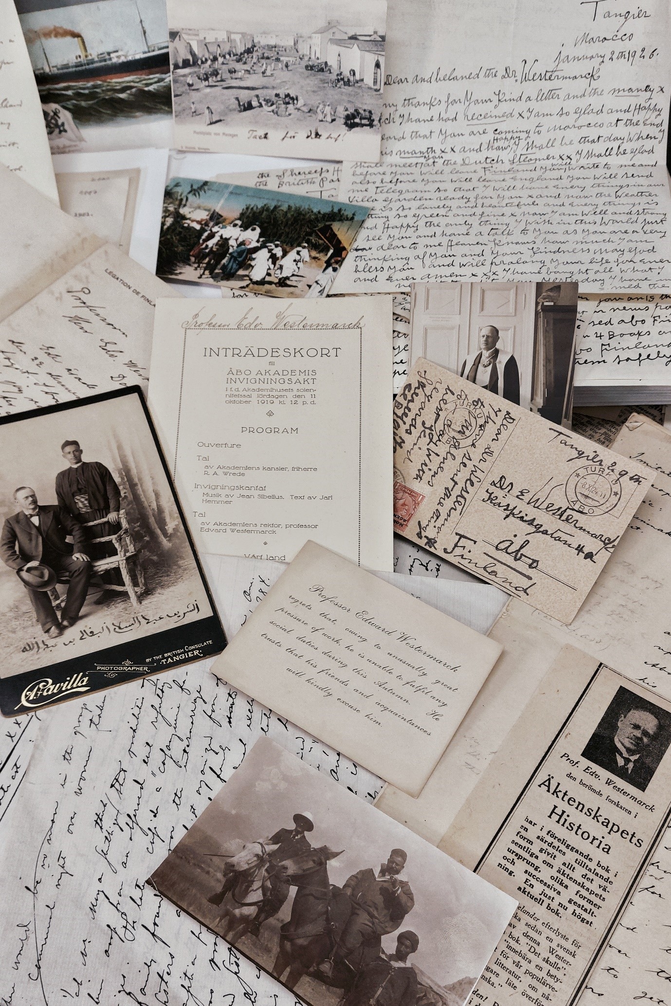 Westermarckin kokoelma sisältää kirjeitä, postikortteja, valokuvia, käsikirjoituksia ja muistiinpanoja. Kuva 1, kuva 2, kuva 3 , kuva 4. Valokuvaaja: Martin Ellfolk.