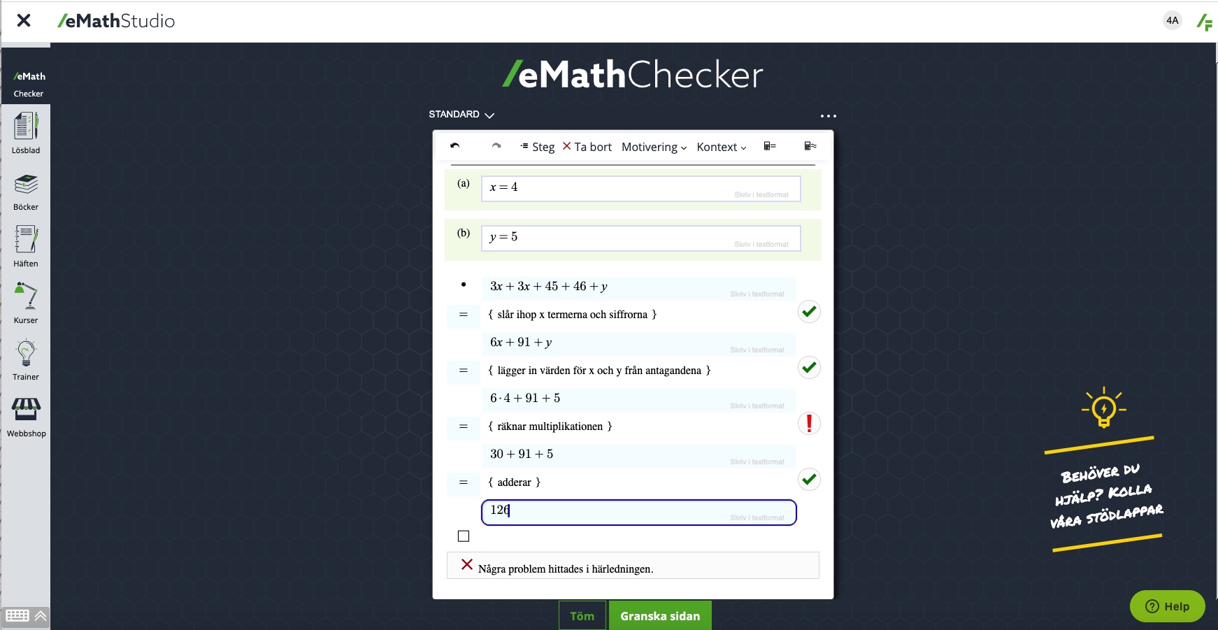 Verktyget eMathStudio ger direkt feedback på om eleven löst någon del av processen på fel sätt.