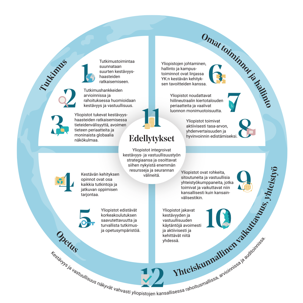 Teeseissä listataan keskeisiä toimenpiteitä, joihin yliopistot aikovat viipymättä ryhtyä. Näitä ovat esimerkiksi kestävyyden ja vastuullisuuden perusteiden tuominen kaikkiin opintoihin, päästöjen vähennystavoitteet, määrätietoinen syrjinnän kitkeminen ja kestävyysajattelun sisällyttäminen kaikkeen toimintaan johtamisjärjestelmistä rekrytointikriteereihin ja tutkimushankkeiden arviointiin. Jokainen yliopisto edistää näitä tavoitteita itselleen luontevimmassa järjestyksessä. Keskeistä on, että toimet ovat vaikuttavia ja vuodelle 2030 luotu visio saavutetaan.