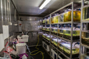 | Klimakontainern Bredvid ladugården står sedan år 2017 en klimakontainer med 36 st. mindre akvarier. Här är det möjligt att justera både ljus och temperatur enligt behov. | ![]() |
