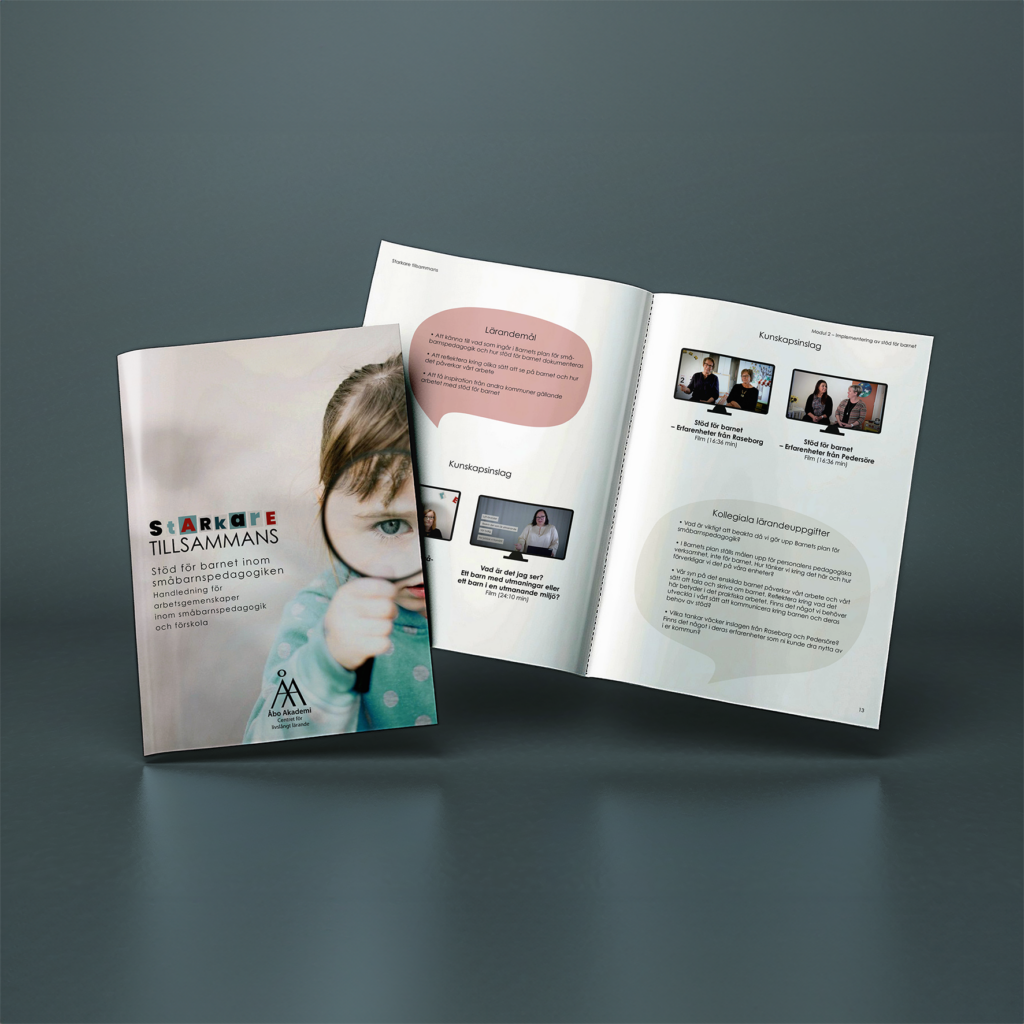 Upplägget och materialet är utformat för att möta förutsättningarna hos personalen inom småbarnspedagogiken och stöda deras gemensamma arbete. I materialet som skapats för fortbildningen medverkar ett stort antal sakkunniga som belyser stöd för barnet ur olika synvinklar. Handledningen består av lärandemål, kunskapsinslag och kollegiala lärandeuppgifter som arbetsgemenskaper inom småbarnspedagogik kan använda för att jobba med stöd för barnet.