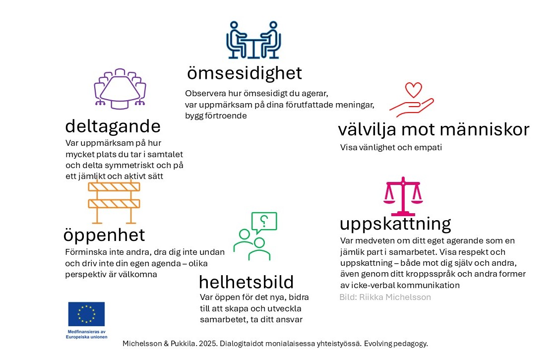 I dialogen är målet att tänka, samtala och agera tillsammans på ett jämlikt sätt samt att skapa något nytt i samarbete med andra aktörer. I centrum står ömsesidighet. När man agerar ömsesidigt visar man omtanke om andra deltagare och förstår att det egna agerandet påverkar andra – och antingen främjar eller hindrar exempelvis en trygg och förtroendefull atmosfär (Aarnio, 2010, 2012). Istället för att anta eller gissa är det viktigt att fråga om andras tankar eller yttranden.
