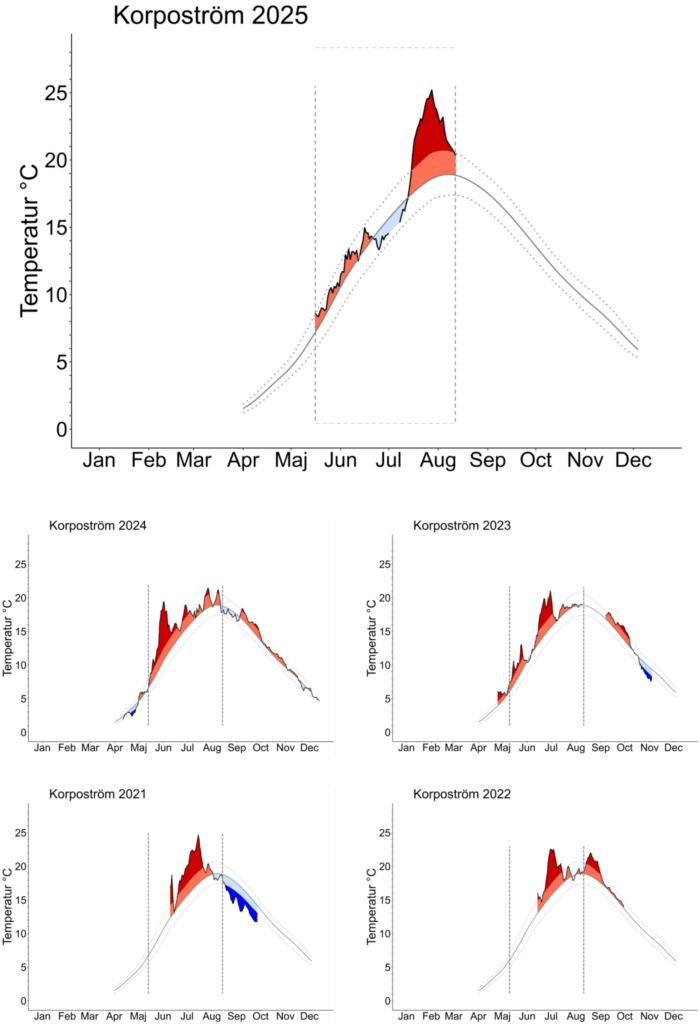 Under de senaste åren har vi registrerat värmeböljor varje sommar, men antalet, tidpunkten, varaktigheten och de maximala temperaturerna har varierat. Sommaren 2024 var till exempel ovanligt varm, med fem distinkta marina värmeböljor. Den längsta varade i 32 dagar och den kortaste i endast sex dagar. Normala vattentemperaturer i början av juli är cirka 16°C och i slutet av juli omkring 19°C. Den högsta temperaturen som uppmättes var 21,5°C (uppmätta på Själö i norra Nagu på en meters djup 2006–2007 och 2009–2021). Sommaren 2025 var däremot relativt kall under större delen av säsongen. I mitten av juli steg temperaturen snabbt och en extrem värmebölja som pågick i 27 dagar uppvisade maximaltemperaturer på över 25°C.