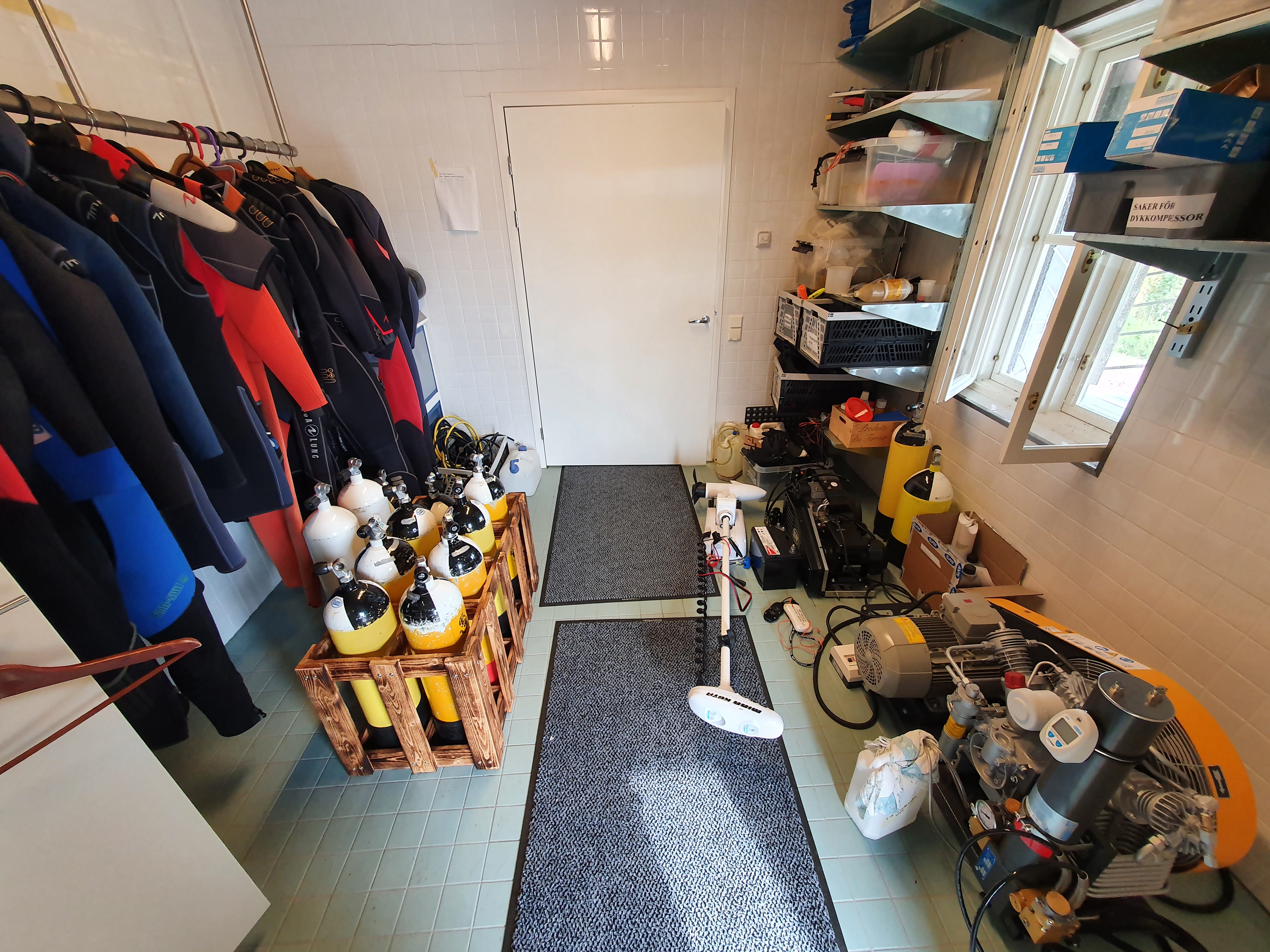 Dykning: tryckluftflaskor (300 bar), regulatorer, vikter, kompressor. Forskarna använder personlig dylutrustning.