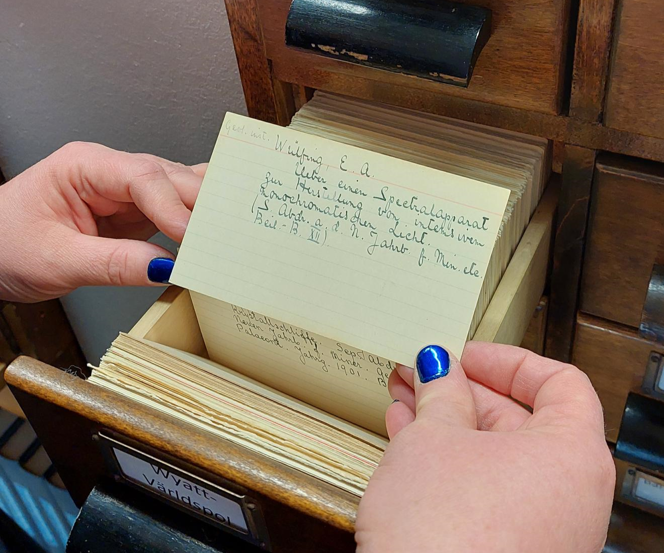 – Korten är väldigt systematiskt skrivna om man beaktar att de skrevs före datorernas tid; det fanns väldigt tydliga regler kring hur det skulle stå, inte minst när det gällde mellanslag och skiljetecken. Det var ju ett analogt informationssystem, väldigt avancerat. De ursprungliga korten i katalogen är skrivna för hand, men de flesta korten är skrivna på skrivmaskin. I Boktornet fanns det i den nyare delen byggd 1958 till och med ett rum som hette maskinskrivningssalen. Arbetet med kortkatalogen har varit både omfattande och till stor del manuellt, berättar överbibliotekarie Yrsa Neuman.