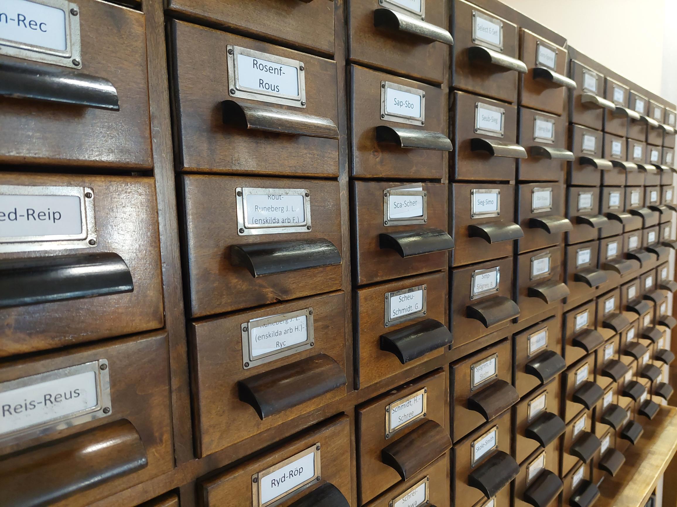 – Den främsta regeln då det gäller kortkatalogen är ju att korten inte får tas ut ur skåpet, annars går hela systemet förlorat. Så vi funderade mycket på hur vi skulle gå till väga. Vi testade att skicka hela möbeln med innehåll men det var alldeles för besvärligt. Till sist blev det så att vi skickade kortlådorna nerpackade i flyttlådor, förklarar Backman.