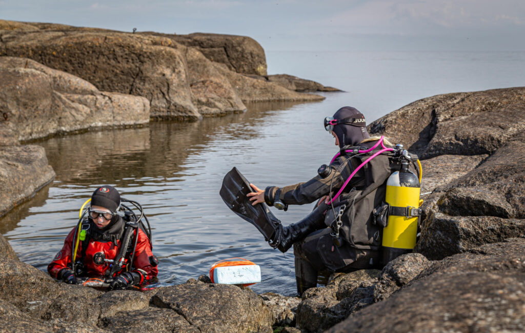 Så här kan det se ut när havsforskare arbetar i fält. Åbo Akademis marinbiologer karterar arter i ett blåstångsbälte: