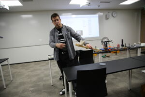 I föreläsningssalen Rhodium plockar äldre universitetslektor i fysik Johan Lindén undan den tredje och sista förevisningen av sin Interactive physics demo.