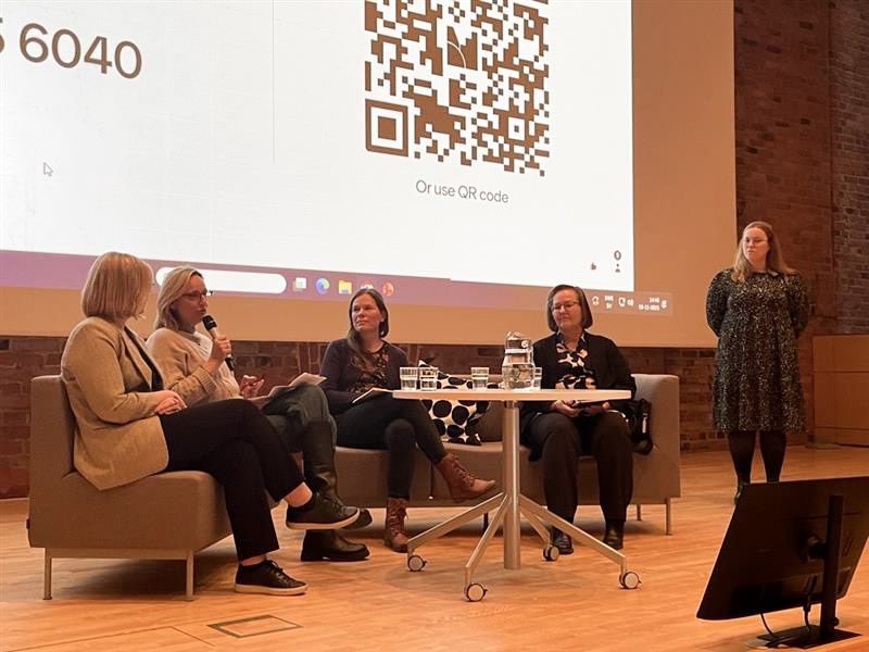 välmående samt på att Hem och skola-samarbetet prioriteras. I panelen sitter Anna Widlund, Åbo Akademi, Micaela Romantschuk på förbundet Hem och Skola, Christine Söderek på Utbildningsstyrelsen och Christina Knookala, Vasa stad. Stående till höger är Sanna Tuomela. Bilden är tagen på projektets slutseminarium.