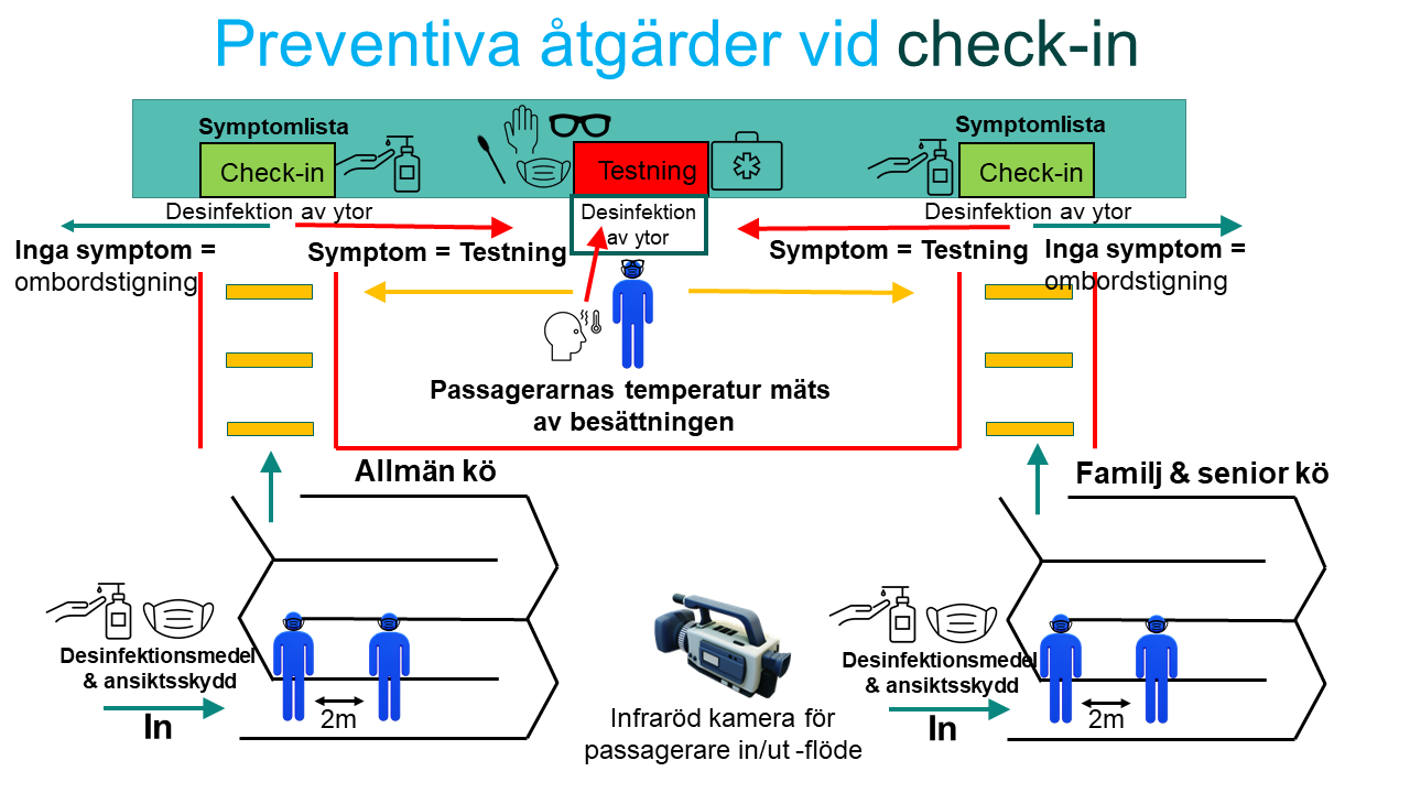Därtill har forskarna beskrivit hur olika säkerhetsnivåer kan användas för att hämma spridningen av virus ombord, beroende på smittläget. Det innebär att man under pandemier minskar mängden passagerare, ökar rengöringen av ytor, minskar behovet av att behöva köa och förkortar vistelserna i gemensamma utrymmen genom att till exempel erbjuda elektronisk bokning av restaurangplatser. Genom att placera handdesinfektionspunkter och rekommendationer om ansiktsskydd vid entréerna och genom att skaffa utrustning för coronatester för färden minskar risken ytterligare att virus sprids.
