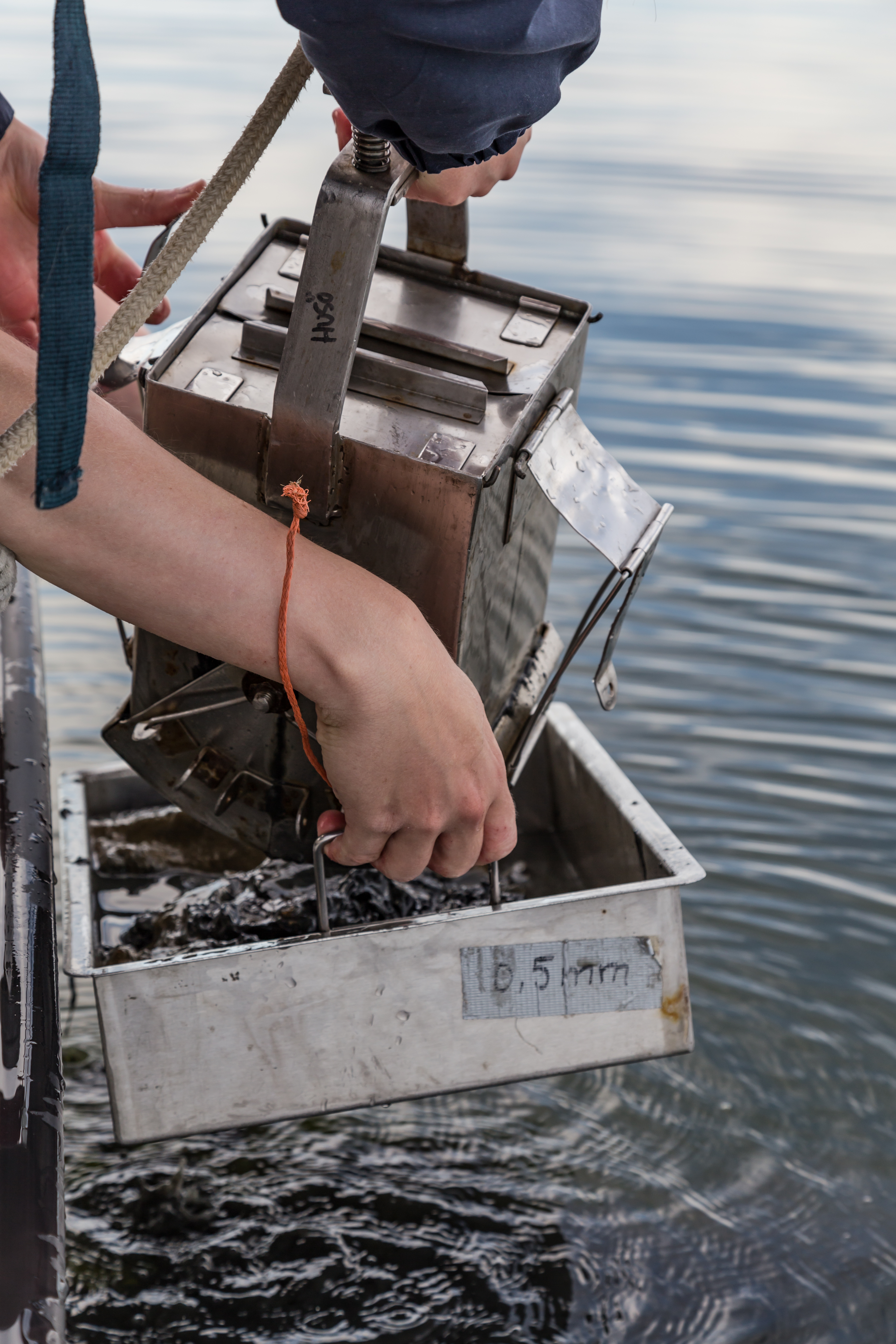 Innehållet i en Ekman-bottenhuggare töms över ett såll. Sållningen görs så att det lättare går att identifiera och hitta alla de små bottenlevande djuren som annars gömmer sig i leran. Foto: Tony Cederberg