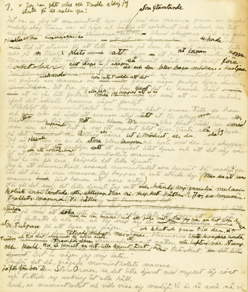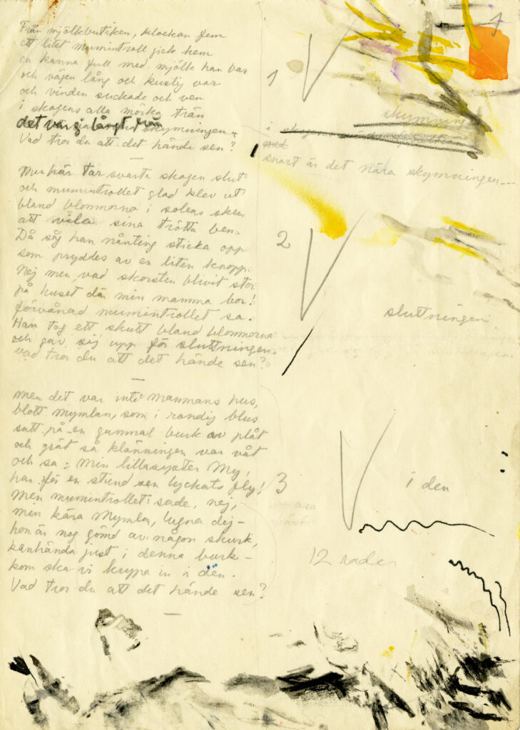 Omslagsbild: Originalskiss till pärmen för Hur gick det sen? Handskriftssamlingarna, ÅAB. ©Moomin Characters™