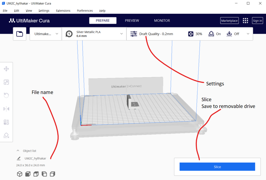 - Change the settings if needed and then press ”Slice” (this slices the 3D-model into hundreds of thin layers the printer can then start to build up)