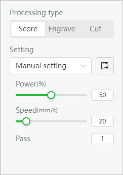 NOTE! If you are using a predefined material, do not alter the values. If you are using a material that is not predefined, it might be beneficial to test on a small area and adjust the power and speed values based on the test.